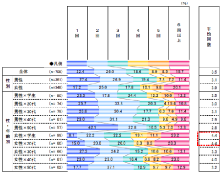 ・最近1年間での購入平均回数は全体では1〜2回だが、『女子学生』『女性20代』は4.4回で最も多い。