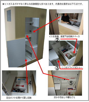 高さ160cm、幅100cm、奥行き72cmと、家庭用の冷蔵庫程度のコンパクトな設計でありながら、内部にはデスク・書棚・電灯・イスを装備。また、キャスターを装着しているため女性1人でも簡単に移動ができるという。