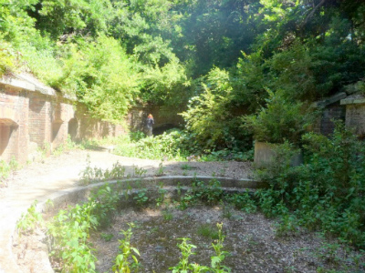 どんどん先に進むと『砲座』がありました。大砲を据え置いていた場所で、第3砲台に8門もあります。直径3.5mの砲座はとても大きいものの残念ながら雨水が溜まっていました。