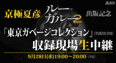 さらに、番組では、この日のためにスペシャルコーナー「教えて平山先生♪ やってみて京極先生!」も敢行。現在、平山、京極への質問や叱咤激励、『ルー=ガルー』についてのメッセージ、番組へのご意見・ご要望などをtwitterにて募集中。ハッシュタグ「#Tokyogc」をつけてのつぶやき、あるいは講談社ノベルス公式アカウント「kodansha_novels」に@返信というかたちで、受け付けている。(募集期間は、9月28日20時の放送終了まで。)
