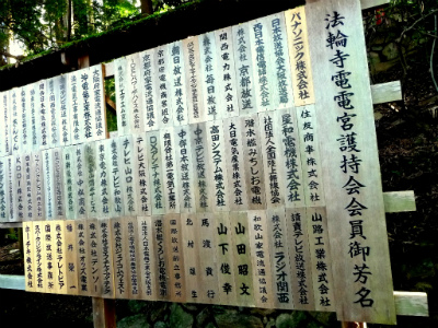 次に、山門からのぼっていくと本堂の手前に電電宮の看板を発見。「電気・電波のまもり神」とあります。小さな社ですが、原子核戦争の脅威に対して世界平和を祈る原子力の守護仏も。さらに、法輪寺電電宮護持会会員の看板には、パナソニックやNHK大阪放送局、NTT西日本、東京電力などの社名がズラリ。