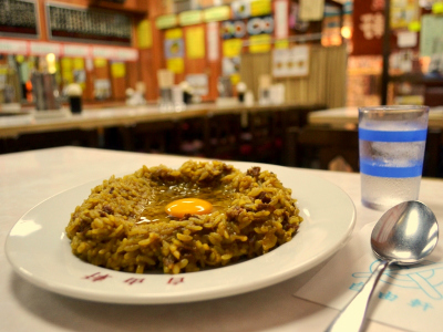 名物カレーは、最初はそのまま、次に卵を御飯とカレーにかき混ぜ、最後は好みでソースをかける。生卵が混じると味がよりマイルドになり、ソースとの相性も意外にいい。一度で3つの味が楽しめるのだ。