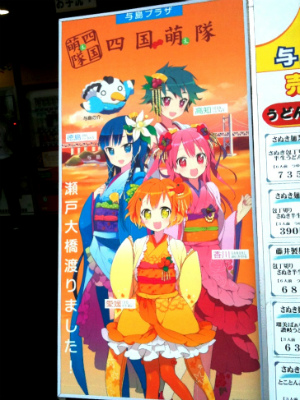 さて、その与島PAの駐車場から施設に入ろうとした時、見慣れない看板を目にしました。今流行の“萌え”なイラストで、かわいい女の子が4人。でもよく見ると「四国萌隊」とあり、それぞれ香川・愛媛・徳島・高知と名前についています。