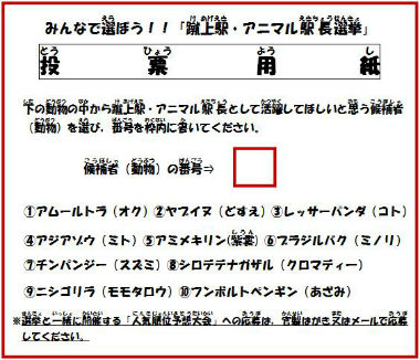 (3)京都市動物園内の3ヶ所の “投票所”で、以下の投票用紙に候補者番号を記入し、投票箱に投票する仕組み。投票期間は2月10日から3月11日まで。そして、3月25日14時から、駅長に選ばれた候補者の動物園内展示スペース前で同駅アニマル駅長「就任式」が行われる予定だ。