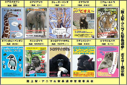 アニマル駅長に立候補したのは、10種の動物たち。アムールトラ、ヤブイヌ、レッサーパンダ、アジアゾウなどで、いずれも同動物園で飼育されている。そして、選挙用のポスター掲示板では、各候補たちが個性的な写真、名前、選挙への意気込みなどを掲載したポスターを見ることができる。