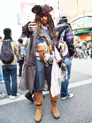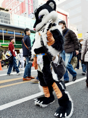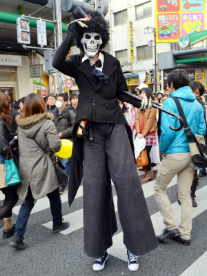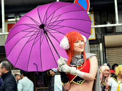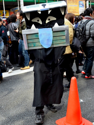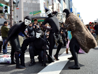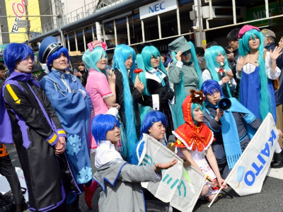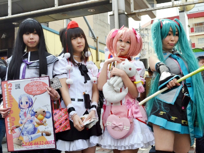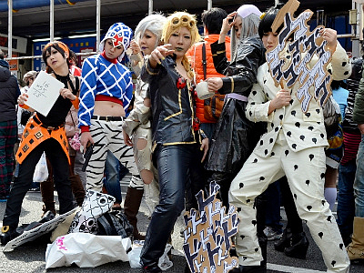 当日11時過ぎから、アニメやゲームなどでおなじみのキャラクター、着ぐるみなどに扮するコスプレイヤーたちが、歩行者天国となったでんでんタウンを南北に走る堺筋をかっ歩し始めた。その途端、そのコスプレイヤーたちをカメラで撮ろうと、たくさんの人々がさらに沿道を埋め尽くし、まともに前に歩けないほど混雑した場所もあった。