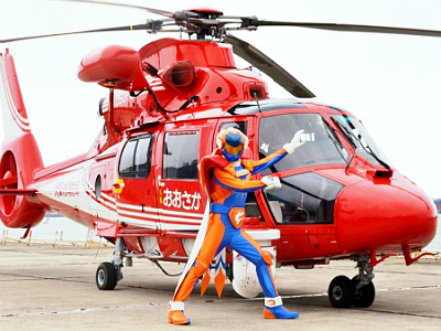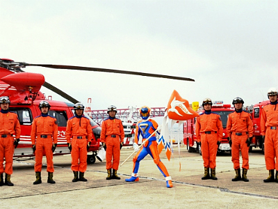 先日、大阪市の鶴浜岸壁にセイバーミライが登場。大阪市消防局の消防車、消防ヘリコプター、消防艇、そして消防隊員らもそろう中、さまざまなポーズを決めるセイバーミライ。そして、マントに棒をさしたかと思うと、まるで江戸時代に活躍した火消しのごとく『纏(まとい)』を振るパフォーマンスも見せた。