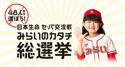 各球団4選手がそれぞれ4部門にエントリーし、部門ごとにNo.1だと思う選手に投票していく「みらいのカタチ総選挙」だ。部門は「みらいの目標にしたい選手」、「みらいの大スターだと思う選手」、「みらいの旦那さんにしたい選手」、「みらいの野球の指導者になってほしい選手」となっていて、日本生命セ・パ交流戦の応援サイトからお気に入りの選手がいれば誰でも投票が可能。