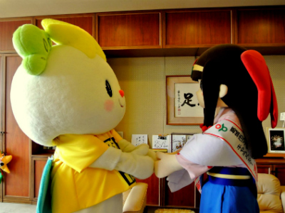 先の4月18日、陸前高田市のマスコットキャラクター「たかたのゆめちゃん」が葛城市を訪問して蓮花ちゃんに会い、陸前高田市での再会を誓うとともに、同市で開催されるさまざまなイベントでの“盛り上げ役”を蓮花ちゃんに要請。これを受け、今度は蓮花ちゃんが5月24日に陸前高田市を訪問し、同市の戸羽太市長と対面した。