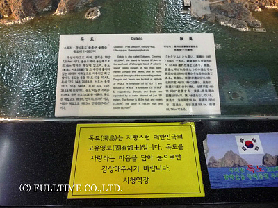 そして、ハングルと英語、日本語の3ヶ国語で簡単な紹介文がありました。もちろん、名称は韓国ですから「独島」です。所在地は、日本が主張する島根県ではなく「慶尚北道鬱陵郡鬱陵邑独島里1〜96番地」。そして「『トクソム』とも言い、面積は18万7554平方メートルである。鬱陵島から東南方向へ87.4km離れた海上にあり・・・」と、島の場所や火山島であること、2つの小島からなることなどが紹介されていました。