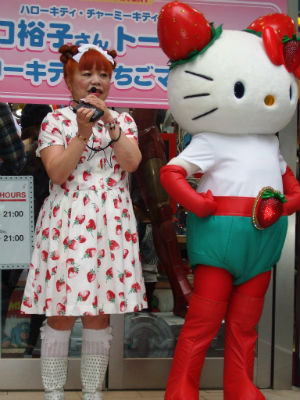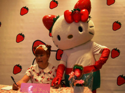 今回、ハローキティ「ICHIGOMAN」東京初登場を記念し、ハローキティ・デザイナーの山口裕子さんが駆けつけ、集まったファンたちと「パワー・ザ・キティ!」と大合唱。すると、耳とベルトのバックルをピカピカ光らせながら「ICHIGOMAN」がさっそうと登場し、現場は一時、騒然とした雰囲気に。その後、山口さんのトークショーやICHIGOMANとの撮影会が行われた。