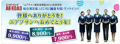 韓国・釜山を拠点に、日本にも運航している航空会社「エアプサン」が、リクルートのエイビーロードリサーチセンターが実施した『エアライン満足度調査2012』において、初登場ながら総合5位、格安航空会社(LCC)の中ではトップに輝いた。これを記念して現在、『ありがとう運賃』が発売されている。
