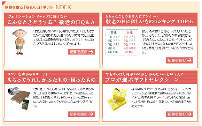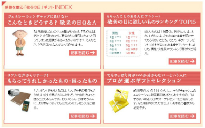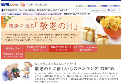 「敬老の日ギフト・プレゼント特集2012」と題して特設されたサイトには、「敬老の日に欲しいものランキング」や「もらってうれしかったもの・困ったもの」といった興味深い情報が満載。