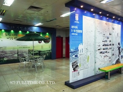一方、デザイン都市として知られる光州の地下鉄では、それぞれの駅のデザインがユニークでこだわりが見られました。おしゃれな柱にベンチもあるので、女子学生が休憩しながら話しこんでいたり、ベビーカーを押した若いお母さんが休憩していたり。また「5.18光州事件」が発生した場所に近い駅では、その事件を紹介するパネル展示も。