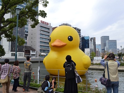 今回のイベントは、大きく分けて「水都大阪2012水辺のまちあそび」と「おおさかカンヴァス推進事業2012」の2つ。まず、水都大阪のほうは、根強い人気のある巨大“ラバーダック”が、2009年の水都大阪のイベント以来、中之島に復活。展示初日の14日朝、早速、カメラを片手にラバーダックの写真を撮る人々がたくさん詰めかけていた。