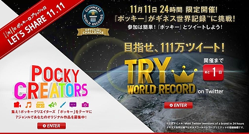 「TRY WORLD RECORD on Twitter」では全国のTwitterユーザーに協力をしてもらい、11月11日のよき日にポッキーが「24時間にもっともツイートされたブランド(Most mentions of a brand name in Twitter in 24 hours)」としてギネス世界記録™に認定されることを目指しているのだとか。