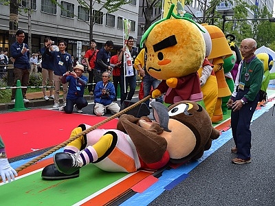 この綱引きに参加したのは、東大阪・石切参道商店街の「いしきりん」、太子町の「たいしくん」、藤井寺市の「まなりくん」、箕面市の「滝の道ゆずる」など合計15体。綱引きは予想以上の盛り上がりを見せ、着ぐるみが勢いで後ろに横に倒れたり、キャラのスタッフまで加勢したり、途中から子どもたちも参加したり。結果、2回の勝負は1勝1敗だった。