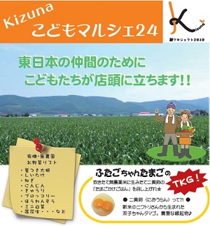 今度は「kizunaこどもマルシェ24」を開催します。東日本のお友だちのために「お野菜販売スタッフ」として店頭に立ってくれるこどもたちを大募集しています!商品売上の一部は「東日本こどもたち支援」に活用されます。