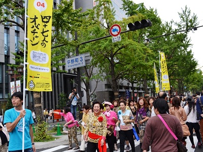 先頭に立っているスタッフらしき人が手にするのぼりを見ると『四十七人のオバチャーン』とある。47人のオバチャン!?…そう、47人といえば赤穂浪士、あの忠臣蔵のメンバーと同じ数。それにあやかったかどうかは不明だけど、とにかく47人もオバチャンがそろうと、皆で発するオーラがものすごい。しかも、おばちゃんたちは道行く人に“アメチャン”を配っている…大阪では飴、キャンディーのことをアメチャンと言う。いやはや…
