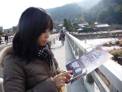 1つ、2つ、3つ・・・と、次々に指示されるスポットに、嵐電に乗っては降り、どんどん足を運んで仮面ライダーウィザードと一緒に敵と戦っていく。画面のビジュアルがとても鮮明で美しく、案内画面にひらがなが多いので仮面ライダー好きの親子でも楽しめそう。