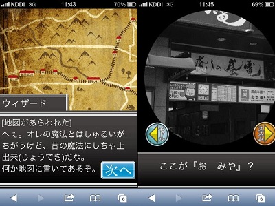 古地図が画面に表示され、1つのスポットを押すと、そのスポットに向かうための案内画面が出てきた。その案内に従って歩き出したが、よく周りを見ないと見落とす小さなポイントもあったので要注意!