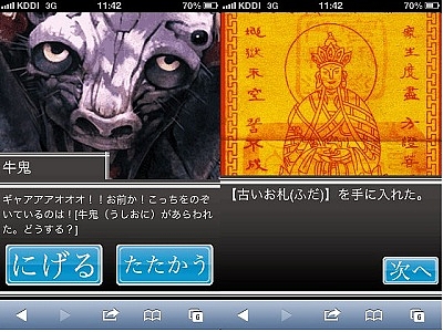 自分が最初に到着したスポットは、新選組で有名なあのお寺だった。ここで画面上に表示された場所で「GPSチェック」を押すように指示され、押してみるといきなりモンスターが登場。その妖怪を、画面上にある武器アイテムを選んで倒すと、ここでのミッションはクリアとなり、また次のスポットに行くように指示される。戦いの後、敵が重要アイテムを落とすことも。