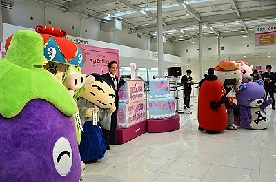 その後、ケーキに見立てた高さ1.5メートルの特製モニュメントをカットして就航1周年キャンペーンを発表。長崎県の「ながさき龍馬くん」、鹿児島市の「ぐりぶー」、福岡県の「聖徳明太子」などのご当地キャラクターも登場し、4月12日に就航予定の仙台からは宮城県の「むすび丸」もやってきた。