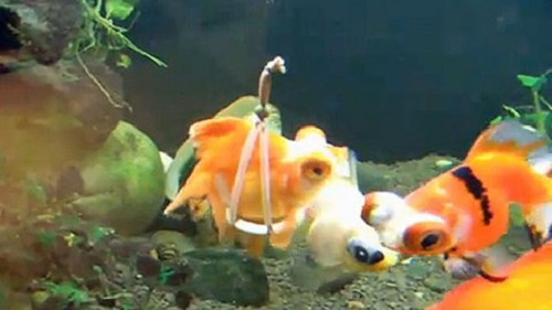 事故や病気で身体が不自由になってしまったワンちゃんやニャンコの義足姿や、車いすを使う様子が話題になることがありますが、自力で浮かぶことが困難になった金魚が、浮き輪(?)のような補助器具を作ってもらったというお話しです。