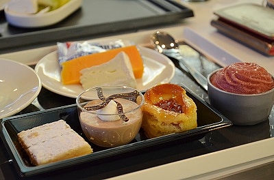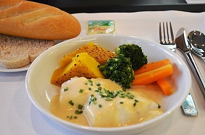 エールフランス航空の「ビジネスクラス機内食」(3800円)は、クラブミートサラダの“アミューズ”からはじまり、季節のサラダ、スモークダックやグリルしたエビのマリネなどの“前菜”と続く。“メイン”は、牛フィレ肉のソテー リヨネーズソースかカラスカレイの白ワインクリームソースのいずれか。カマンベールチーズなどの“チーズ”やセブングレインローフなどの“パン”もつき、最後は“デザート”でチョコレートムースやラズベリーシャーベットが提供される。フリードリンクつき。