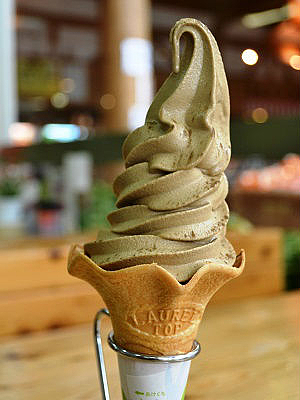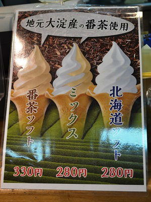 まず、330円という価格は、いくらご当地ソフトとはいえ決して安くない。その理由は、このソフトに使われている番茶が、数ランクあるうちで一番高いものが使われているからだ。そしていざ番茶ソフトを食べてみると、上品な甘さの中に番茶の苦みと風味が感じられ、どちらかというと“大人のソフトクリーム”という印象。番茶がベースなので、子どもでも安心して食べることができる。番茶パウダーをかけるとますます美味しい。