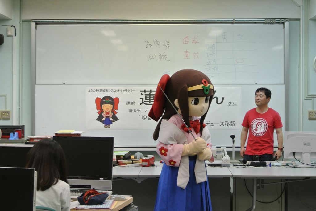蓮花ちゃんは、先の5月28日、初めて教壇に立つことになった。場所は、奈良市の県立奈良朱雀高校。同校には観光ビジネスを学ぶ授業があり、奈良県でせんとくんに次ぐ活動出演数を誇る蓮花ちゃんに、ゆるキャラを利用した観光ビジネスなどの授業を高校生たちの前でできないかと白羽の矢が立ったのだった。
