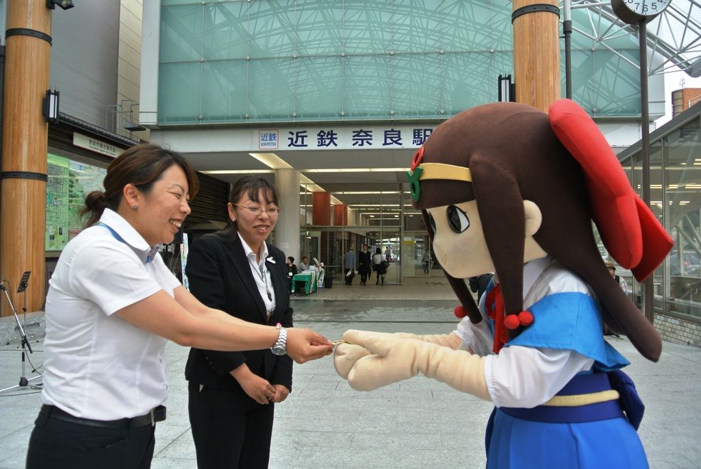 そして、先の6月28日、その名刺の最初の1枚をせんとくんに渡すため、奈良県庁を訪れた。蓮花ちゃんは自身のイラストが描かれた青、黄、ピンク色の名刺をせんとくんにプレゼントした。せんとくんも、あらかじめ用意していた名刺を蓮花ちゃんに手渡し、「無事にゴールできるよう応援してるよ」と温かく激励した。