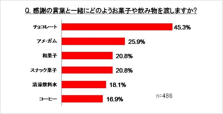 また、感謝の言葉と一緒にお菓子や飲み物を渡す習慣があるかを尋ねたところ、そうした習慣がある人は2人に1人(48.6%)に上りました。そして、そうした場面で最も渡されていたのは「チョコレート(習慣がある人の45.3%)」でした。感謝の気持ちと一緒にチョコレートを渡す行為が、広い世代で親しまれているようです。