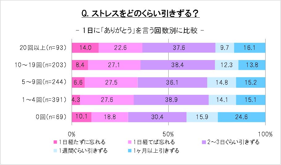 同調査では、「ありがとう」という言葉を口に出して伝えることの“効果”についても興味深い結果が見られました。「ありがとう」をたくさん言う人ほど精神的なストレスを引きずりにくく、1日に20回以上言う人の36.6%がストレスを受けても1日経てば忘れると回答。全く言わない人の40.5%が1週間以上引きずるのとは対照的な結果となりました。
