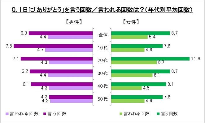 なお、男性は上の年代ほど「ありがとう」を言う回数が減り、50代男性の平均(4.3回)は、10代男性の平均(7.8回)の半分に留まるという結果も。現代日本では、おじさん世代ほど「ありがとう」に“不器用”なようです。