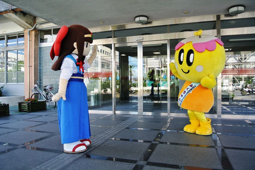 今回、葛城市の隣りに位置する奈良県大和高田市からスタート。同市のマスコットキャラクター「みくちゃん」が市役所前で出迎えてくれた。そして、サイコロをみくちゃんの頭の上で転がし、見事“6”が出た。その模様など早速、自身のブログに記事をパソコンでアップする蓮花ちゃん。