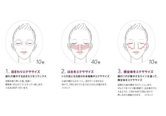 目まわりとほおのエクササイズ、最後に顔全体のエクササイズを行い、適度な刺激をあたえる事で、はりと透明感のある肌を目指せる。