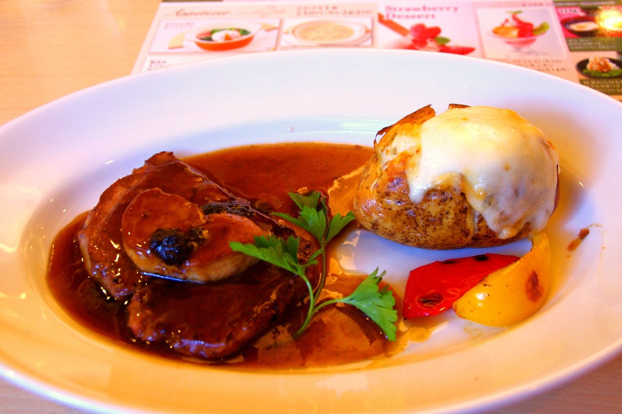 フォアグラを上に載せているのは、フィレステーキとハンバーグの2種類。ベイクドポテトはフィレステーキのみグラタン風だったりと、つけあわせにも微妙な変化があり、ハンバーグの方を食べれば、次の機会にはステーキも…という気分にさせる。