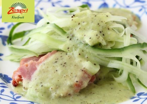 食べ方の中で衝撃だったのは「グリーンキウイドレッシングソース」。ミキサーにキウイと一緒にドレッシングの材料を入れて撹拌する。焼き豚やソテーしたとり肉、牛肉、かじきまぐろなどに合うらしい。写真では青々としたキウイの色が肉料理に彩りを与えている。