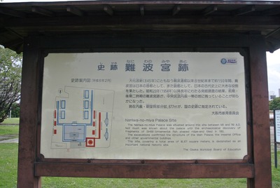 難波宮史跡公園に設置されている案内板などによると、この難波宮は長らく“幻の宮”といわれていたが、1954年(昭和29年)からの発掘調査により、1961年(昭和36年)に大極殿が発見された。現在、大阪城公園の南西角にあたる馬場町(ばんば)交差点から約200m東南の場所に、この大極殿の基壇を復元した石造りの壇が見られる。