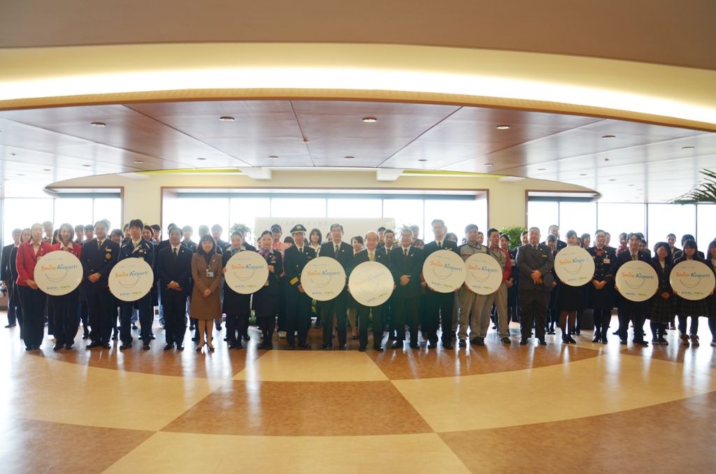 そんな伊丹空港で、今回の75周年を記念したセレモニーが1月23日に開催された。航空会社の機長や客室乗務員をはじめ、空港案内、空港ホテル、リムジンバス、モノレール、さらに警備や清掃まで空港の支えるさまざまな業種のスタッフ66人が一堂に並び、記念撮影が行われた。同空港のスローガン「Smile Airport!」グッズの空港利用者への配布、地元の大阪府池田市にある府立園芸高等学校フラワーファクトリ科の生徒が制作した生花で彩られた「Smile Airport!」パネル、「フラワーフォトスポット」も設置された(3Fラ・ソーラテラス、2月6日まで)