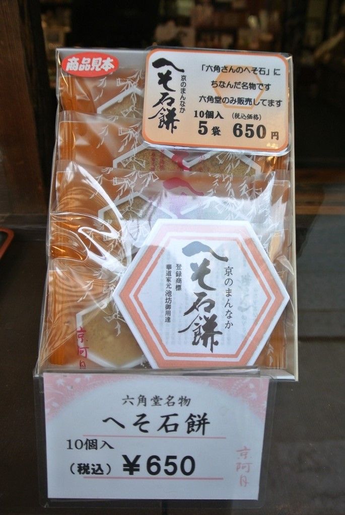 実際のところ、へそ石の正確な史実は解明されていない。諸説によると、石灯籠の基礎だとか、六角堂の初代本堂の礎石だったとも伝わる。江戸時代ごろからへそ石と呼ばれるようになったといわれ、『洛中洛外図』には六角堂に隣接する六角通にあるのも描かれている。境内では、へそ石にちなんだ「京のまんなか へそ石餅」なるものも販売されている。