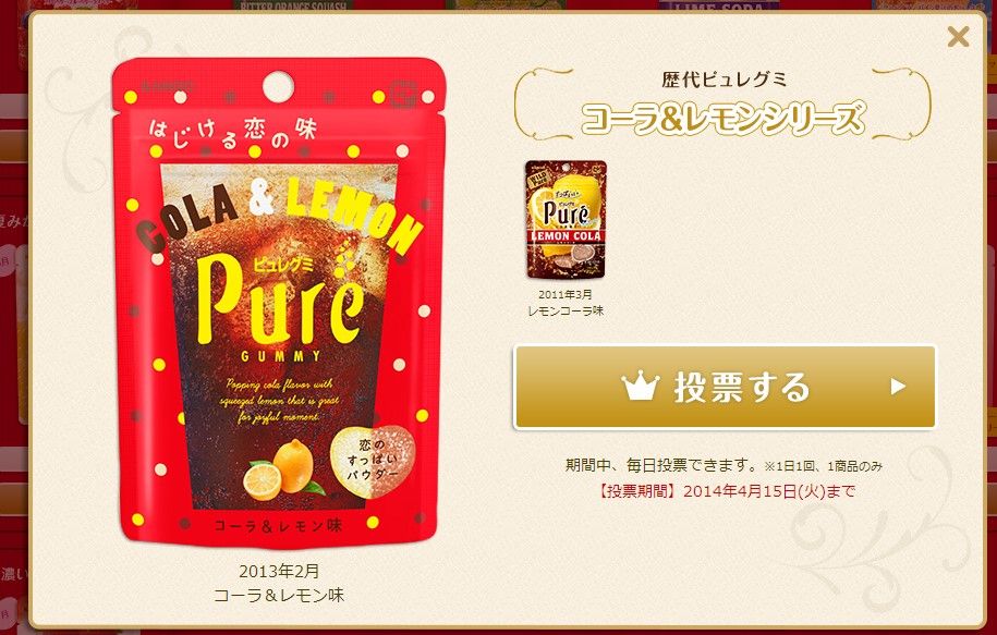 前述の公式ホームページに戻ると、元祖すもも味の発売を記念してこれまでに販売されたフレーバーの中から1つを投票して、もっとも票を集めたものがこの秋に復活するというキャンペーンが行われていた。