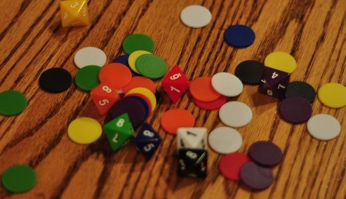 もし、他の人と同じ数字、図形を示していたら、同調したものとして、その人(たち)の色チップを貰えます。もし、自分だけ単独で示していたら、自分の色チップを貰います。これで1ターン終了です。