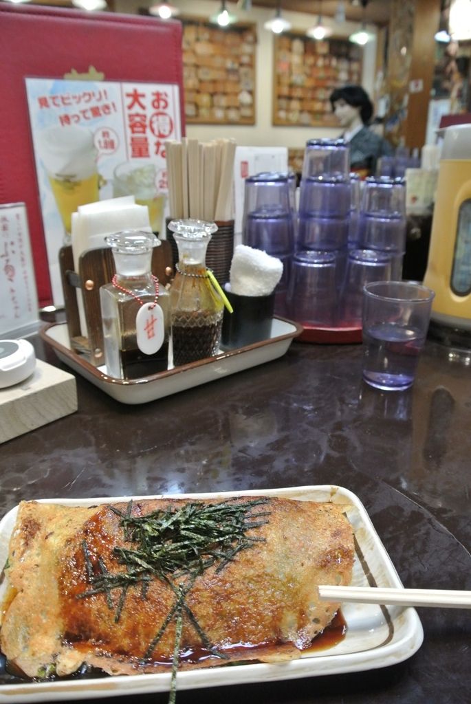 テーブルに座って壱銭洋食とドリンクを注文してみる。少々の待ち時間があるが、店内や絵馬を眺めていると時間はあっという間に経ち、ほどなく壱銭洋食が運ばれてきた。待ち時間も飽きることがない店内のさまざまな仕掛け。お一人様ももちろんOK、カメラを片手に熱心に撮影する外国人観光客の姿もチラホラ見かけた。