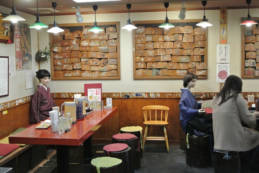 そして店内に入ると人間、でなくマネキンがポツリポツリと座っている。壁に飾られている絵馬の内容は少々エッチだが、ついつい読んでしまう。