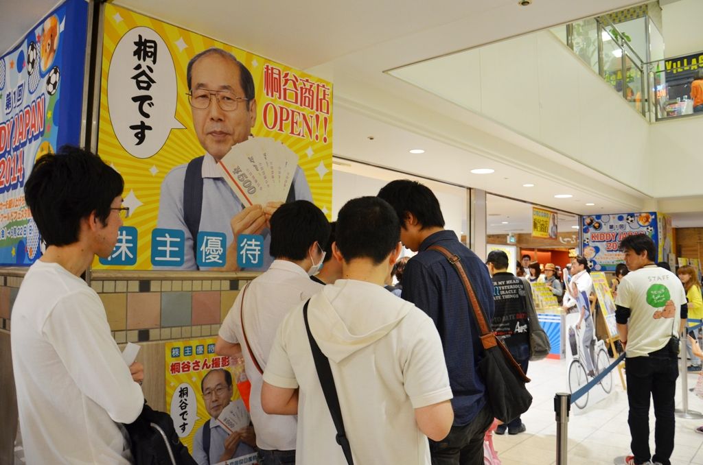 その桐谷さんが6月7日、キデイランドがプロデュースする阪急三番街地下2階特設会場に期間限定オープンした株主優待生活「桐谷商店」に登場。関係者が「ふなっしーが登場した時以来かも」というほど、たくさんの人が集まった。