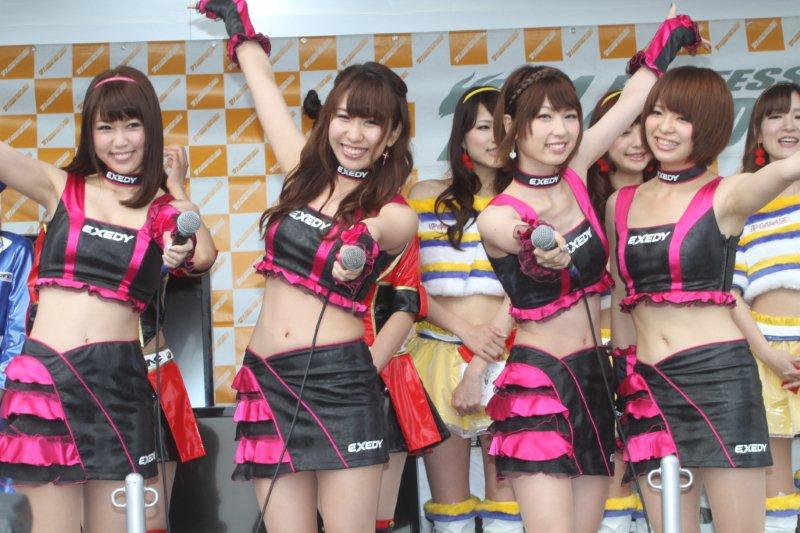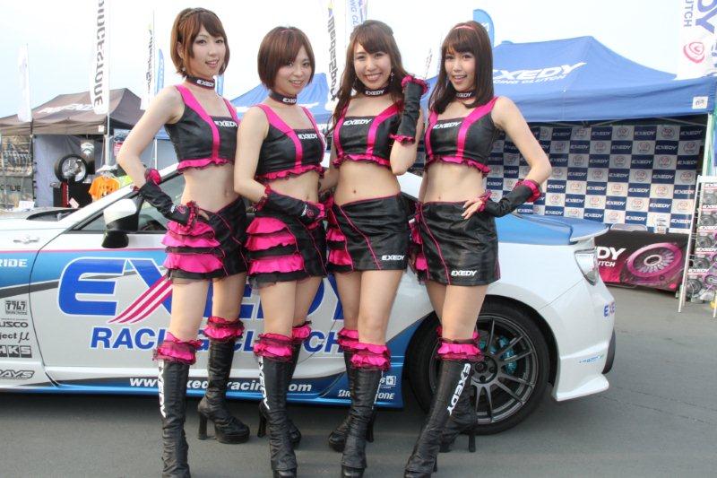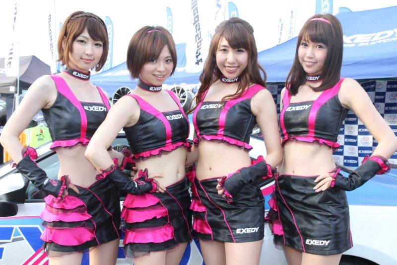 場内のイベント広場では各チームが出展ブースを出しており、本番のレースが始まる前にレースクイーンの美女たちを発見。メインステージの向かいでブースを構えていたエクセディレーシングガールの美女4人が勢揃いして撮影タイムを行っていたので早速こちら も参戦!