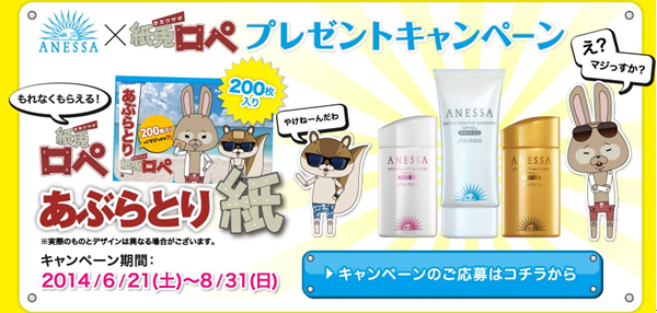 「紙兎ロぺ特製 あぶらとり紙(200枚入り)」のプレゼントキャンペーンは8月31日まで。すごく先のようだが、夏休みがあっと言う間に終わってしまうことは大江千里も歌っていたとおりなので、早めにアネッサを購入して、早めの日焼け対策とプレゼントをゲットしよう。