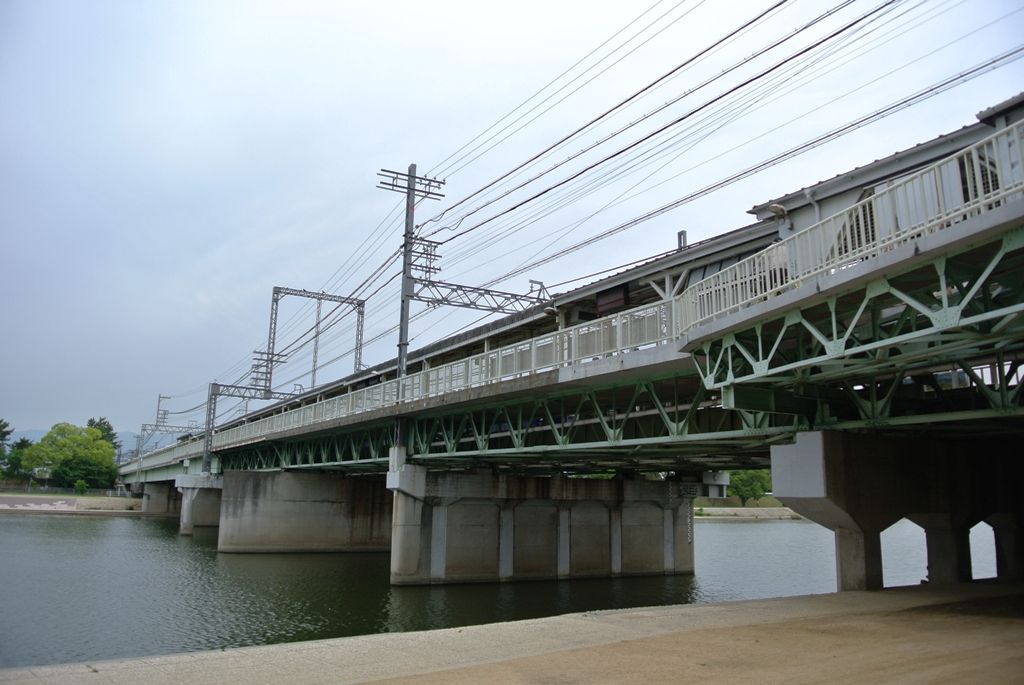 武庫川駅は、兵庫県尼崎市(東)と西宮市(西)かかる武庫川にあり、駅舎は川のそれぞれ両端に設けられている。そして、本線の上り線と下り線のホームはその川を「またぐ」形で設置されている、まさに水の上にある駅。その様子は、実際にホームに立つとよくわかる。